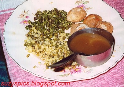 dahi puri (Yoghurt, potatoes, sprouted moong beans in a puri)